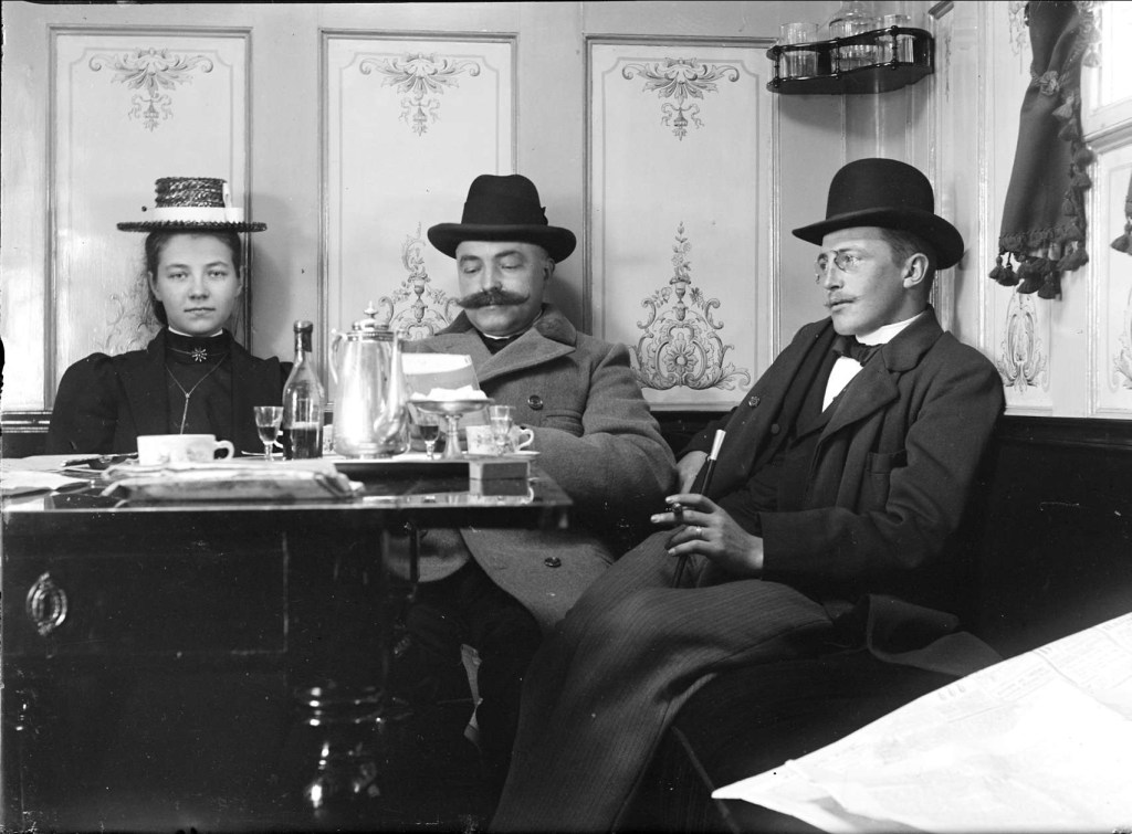 Bilden ovan är oerhört intressant och sällsynt! Eftersom den väcker så många tankar och frågor hör den till en av mina favoriter. En scen från 1902. De tre kafébesökarna står i fokus. Kläder, föremål och interiör skapar också stämning och nyansrikedom.
