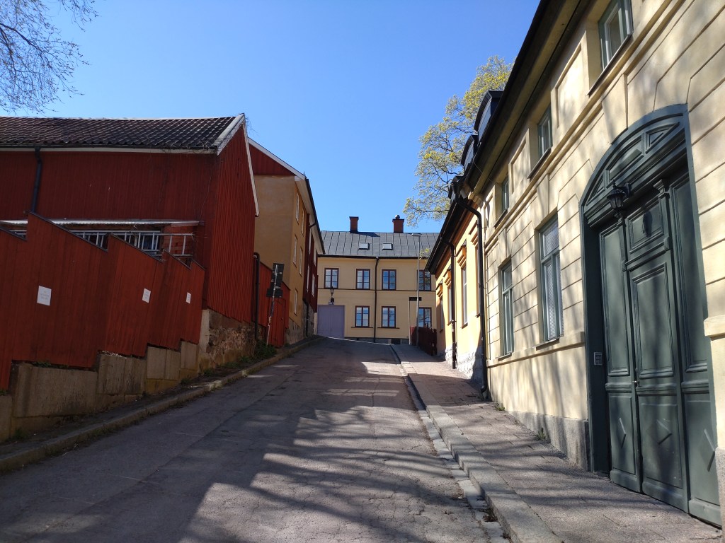 På fotot ser man en liten del av stadsdelen Fjärdingen, närmare bestämt Svartmangatan som leder fram till Övre Slottsgatan. Jag har tidigare skrivit om Övre Slottsgatan där jag också bodde en kortare tid som tjugotvååring. De bevarade kvarteren i Fjärdingen har verkligen själ; det vilar en tidlös stämning över dem. Jag har lärt mig mycket om sena artonhundratalets och tidiga nittonhundratalets Fjärdingen (och andra delar av Uppsala) bland annat genom att läsa Lars Lamberts fotografiska verk: 1800-talets Uppsala i Ostis bilder samt Uppsala kring 1900 : staden och människorna i Alfred Dahlgrens bilder. Där kan man både läsa om människor och platser. Jag har hyllat dessa böcker förut.
